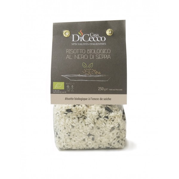 Ingrédients : Riz Carnaroli* 92%, encre de seiche* 2% (contien mollusques), sel marin naturel, farine de riz*, oignon*, céleri*, carotte*, persil*, poireau*, huile dolive extra vierge*, amidon de maïs*, miso* (soja*, riz*, eau, sel, koji), extrait de levure, épices*.