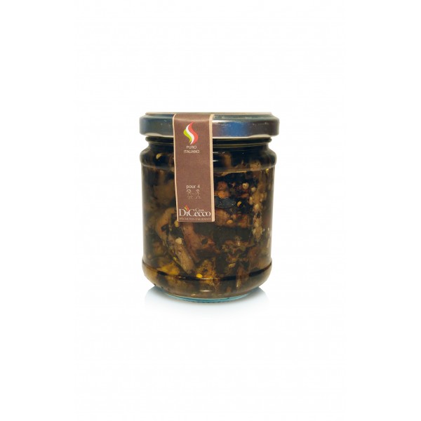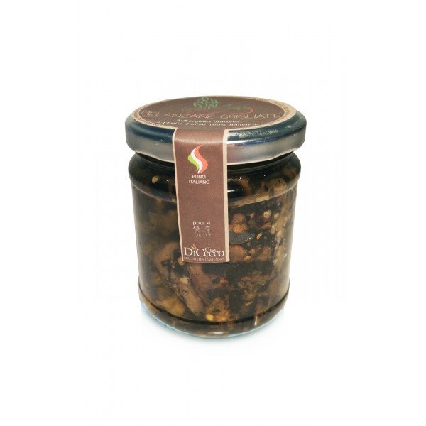 Ingrédients : aubergines (62%), huile d'olive (35%), basilic, menthe, ail, poivre noir, sel, vinaigre. Antioxydants : acide citrique et ascorbique.