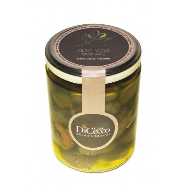 Ingredienti: olive verdi, olio extra vergine d'oliva, aceto di vino, peperoni, sedano, peperoncino, origano, aglio, sale, acido citrico, acido L-ascorbico.